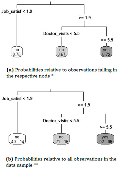 Figure 2b reinstates the relevance of these findings. When the probabilities of the two decision tree branches (if-then statements) that lead to ER = no are considered in relation to the entire sample (rather than just the observations that belong to the branches’ respective nodes), the probability of ER = no remains higher than that of ER = yes. Concretely, for the tree branch Job_satisf < 1.9, the probability of ER = no in relation to the whole sample is 40% (as opposed to 14% for ER = yes). Similarly, for the tree branch Job_satisf ≥ 1.9 & Doctor_visits < 5.5 the probability of ER = no in relation to the whole sample is 21% (as opposed to 16% for ER = yes).