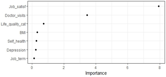 Out of the nine predictors included in the model, two—job satisfaction and doctor visits—have particularly high importance in predicting early retirement (see Figure 3).