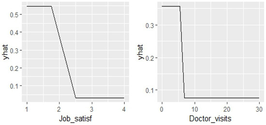The partial dependence plots in Figure 4 show how changes in specific values of the two most important predictors affect the probability (on average) of not wishing to retire early (target class ER = no). Both predictors, job satisfaction and doctor visits, display a clear step-like relationship with the target class ER = no. This indicates that the average prediction probability of the outcome of interest substantially increases when job satisfaction (Job _satisf) is at a level of 2 and 1 (i.e., one is (very) satisfied with their job) and when doctor visits (Doctor _visits) equal 5 or less (i.e., one visits the doctor’s office five times or less in a year). Partial dependence plots are informative because the two predictors are not significantly correlated with each other or with the majority of other predictors (see Appendix C).