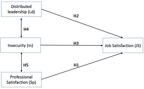The hypothetical relationships are presented in Figure 1, which shows the relationships between the variable of job satisfaction and the variables of distributed leadership and professional satisfaction, as well as the relationships between the perception of insecurity with distributed leadership and professional satisfaction.