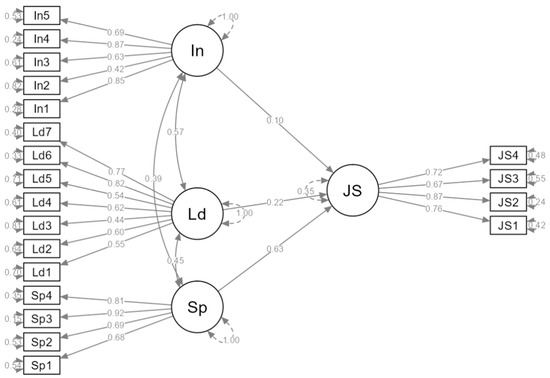 Table 5 shows the latent variables of professional satisfaction (Stp), job satisfaction (Stl), distributed leadership (Ldr), and insecurity (Ins). Each are set with their respective observed variables with the estimation value and the error (SE), as well as the intervals that are lower and higher than a 95% confidence. Furthermore, the β-ratio value, the z-distribution value, and the p-value are also included, and these were <0.001 in all cases.