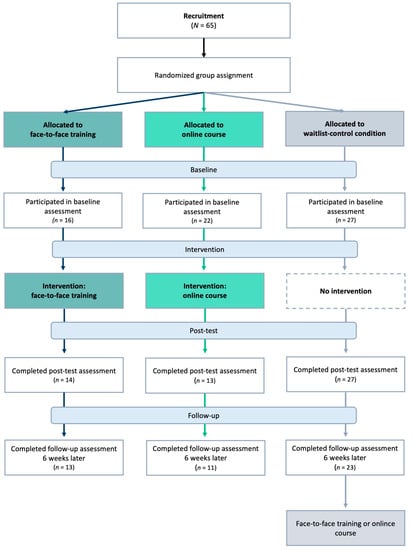 A randomized waitlist-controlled design was conducted with two conditions, an intervention condition that consists of participation in either the face-to-face training or online course and a waitlist control condition (WLC), and three scheduled times of measurement: the first (T1) at baseline before the intervention, the second (T2) shortly after the intervention, and the third (T3) at a follow-up six weeks after T2. These three times of measurement allowed for conclusions about short-term and long-term effects. The self-reported data were assessed via online questionnaires using LimeSurvey Version 5.3.19 [83]. Overall, the study is based on a randomized 3 (face-to-face training vs. online course vs. control group) × 3 (pre vs. post vs. follow-up)-mixed design, which consists of the within-factor time and the between-factor group. Prior to data collection, the study was pre-registered on the Open Science Framework (https://osf.io/ecfhr/ (accessed on 29 September 2023)) and approved by the ethical review board of the Technische Universität Braunschweig (grant no. MA_2022-07). In the research process, an adjustment was made to the preregistered data (i.e., randomization could not be maintained continuously due to absences of participants related to illness and vacation of the participants) because the preregistration was created at an early stage within the research project. Data collection took place between June and September 2022. Upon registration, subjects confirmed their informed consent, and agreement with the privacy policy by checking the corresponding boxes. Furthermore, the project has been given approval by the General Staff Council and Data Protection Officer.