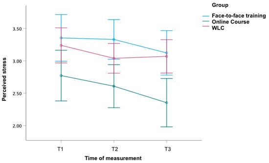 The mean values and standard errors in perceived stress are shown in Figure 2 as a function of group over time. In the figure, trends for the reduction in perceived stress in the intervention groups could be seen.