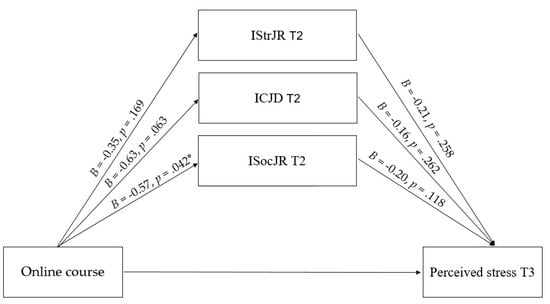 The effect of the online course on perceived stress is mediated by (a) IStrJR, and not by (b) ICJD and (c) ISocJR.