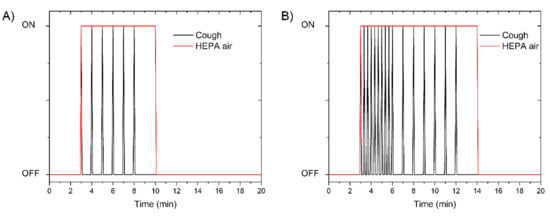 The timeline of the simulated intubation procedure is schematically shown in Figure 2A) and is presented in Table 1. In phase 1, the background particle concentration was measured. Then, the HEPA-filtered air with the flow of 10 L/min was turned on to simulate the air flow of preoxygenation, which could have an impact on the particle concentration. At the same time, the aerosol generator was turned on to simulate coughing. The aerosol generator was turned on once per minute to simulate mild to light coughing. In phase 3, the aerosol generator was turned off, while the HEPA-filter air still flowed with 10 L/min for another 2 min to simulate the ventilation with air before the intubation and after the patient has been put under anesthesia. In phase 4, the HEPA-filtered air was turned off and the decrease of particle concentration was measured for 10 min.