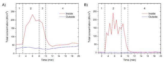 Total concentration measured with the (A) SMPS and (B) LPC inside and outside the protective box during the simulation of the intubation procedure. Numbers 1 to 4 represent different phases of the intubation procedure.
