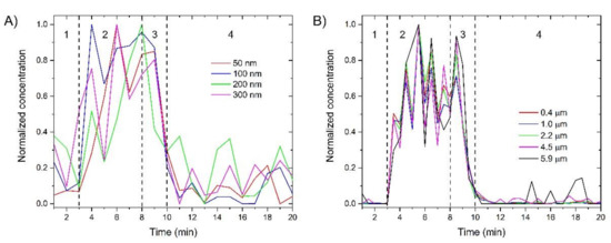Normalized concentration for different particle sizes from (A) SMPS and (B) LPC inside the protective box during the simulation of the intubation procedure. Numbers 1 to 4 represent different phases of the intubation procedure.