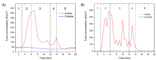 Total concentration measured with the (A) SMPS and (B) LPC inside and outside the protective box during the simulation of the extubation procedure. Numbers 1 to 5 represent different phases of the extubation procedure.