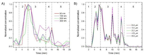Normalized concentration for different particle sizes from (A) SMPS and (B) LPC inside the protective box during the simulation of the extubation procedure. Numbers 1 to 5 represent different phases of the extubation procedure.