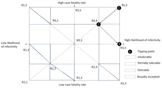A calibrated risk matrix is proposed based on two dimensions (Figure 1). The first dimension relates to the case fatality rate, indicating the proportion of deaths from a certain disease relative to the total number of people diagnosed with the disease for a certain period of time. The second dimension relates to the infection rate, as an estimate of the rate of progress of a disease, based on proportional measures of the extent of infection at different times.