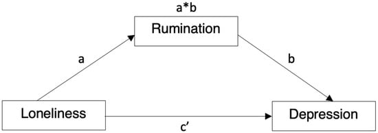 The hypothesized mediation model illustrating the predictive paths between loneliness, rumination, and depression. Loneliness predicts depression (path c); loneliness predicts rumination (path a); rumination predicts depression (path b); loneliness predicts depression if controlled for rumination, indicating a partial mediation (c′); and rumination mediates the relationship between loneliness and depression (a*b).