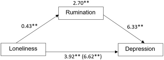 Model of loneliness as a predictor of depression, mediated by rumination with the accompanying unstandardized regression coefficients of each path (N = 288). Number in parentheses denotes path c. ** p < 0.001.