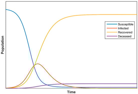 Figure 2 depicts the typical evolution of the variables , , , and over time where the ranges for this model depend on each particular epidemic.