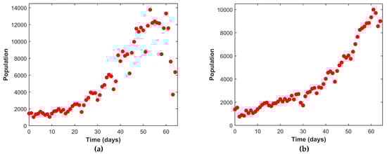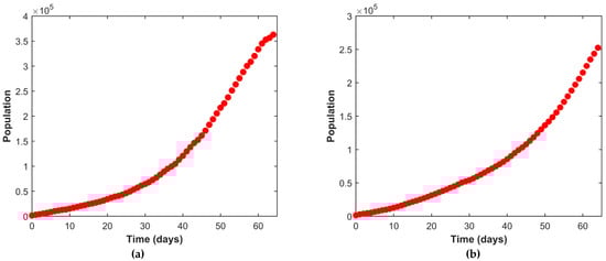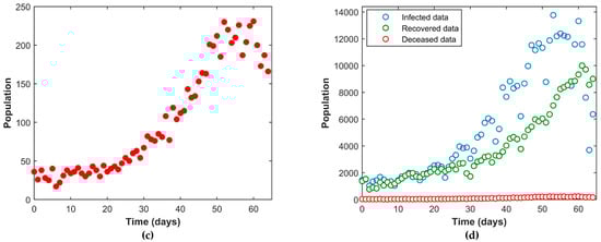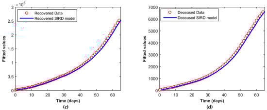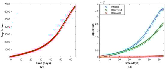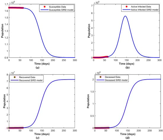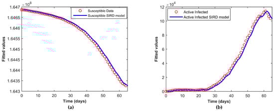 Here, Figure 5a–d depicts the fitting of the susceptible, active infected, recovered, and the deceased population respectively. The continuous line represents our model simulation and the circles depict the real reported data presented in Table 1 for all the cases. From this graphical representation, it is observed that the model simulation and the real data align quite well.