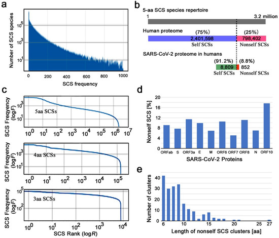 SCS-based characterization of the human proteome. (a) Frequency distribution of 5-aa SCS species. The number of SCS species rapidly decreases as the frequency in the human proteome increases. (b) Correspondence among the 5-aa SCS species repertoire (top), the human proteome (middle), and the SARS-CoV-2 proteome. The top bar indicates the 3.2 million 5-aa SCS species placed linearly from the first one to the last one. The human proteome displays 75% of the 5-aa SCS species repertoire. The bottom bar is on a different scale than the others. (c) Rank–frequency plots for 5-aa SCSs (top), 4-aa SCSs (middle), and 3-aa SCSs (bottom). (d) Percentage of nonself 5-aa SCSs in SARS-CoV-2 proteins. (e) Number of 5-aa SCS clusters in the SARS-CoV-2 proteome in relation to the length of nonself SCS clusters.