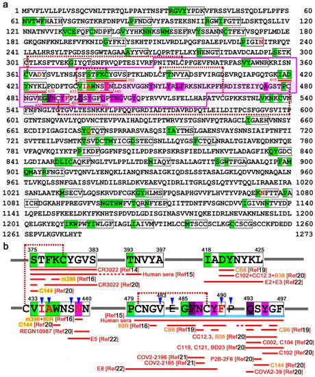 Self/nonself mapping of SARS-CoV-2 spike protein. (a) Nonself 5-aa SCSs and their clusters in the spike protein. Green shading indicates the first amino acid of the nonself 5-aa SCS. The nonself SCSs and their clusters are boxed in black lines. The receptor-binding domain (RBD) (P330–P521) [15] is boxed in red lines. The receptor-binding motif (RBM) [16,38] is shaded in pink. Disulfide bonds [16] are shown by dashed lines between cysteine residues. ACE2-binding residues [14] are shaded in magenta. Four potentially important nonself clusters and a single nonself SCS in the RBD are underlined in red. Eight residues are shown in red letters, which are mutation sites that cause the nonself-to-self status change (N234Q, D364Y, A435S, I434K, N439K, F490L, Q675H, and N1074Q). (b) Potentially important nonself SCS clusters in the RBD. Epitope sequences for neutralizing antibodies are shown under nonself sequences. Antibodies that recognize multiple sites are highlighted in yellow. Blue arrowheads indicate point-mutation sites. The STFKCYGVS and VIAWNSNN clusters together form a 17-aa supercluster (Figure 3). A sky-blue line indicates a 19-aa supercluster from P479 to F497. The IADYNYKL cluster may also join this supercluster (Figure 3).