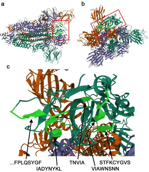 Nonself SCSs in a 3D model of the SARS-CoV-2 spike protein. A 3D structure model of the spike trimer (PDB ID: 6VYB) is shown. Nonself SCSs identified in Figure 2 are highlighted in light green. (a) Side view. The viral membrane is on the left side. The RBD is boxed (also in b). (b) Top-down view. (c) High magnification of nonself SCSs in the RBD.