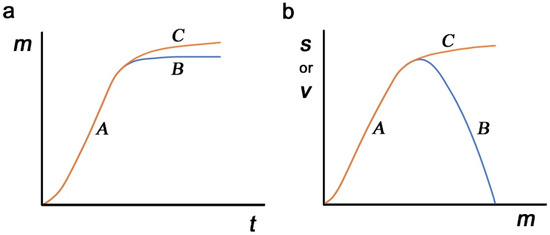 Possible dynamics of mimicry (m), survival (s), and virulence (v) of a parasite. (a) Mimicry mutations (m) as a function of time (t). Routes A–B and routes A–C may be possible. (b) Survival (s) and virulence (v) as a function of mimicry (m). At the relatively low level of m, both s and v may follow A, but after the critical point, v may follow B, and s may separately follow C.