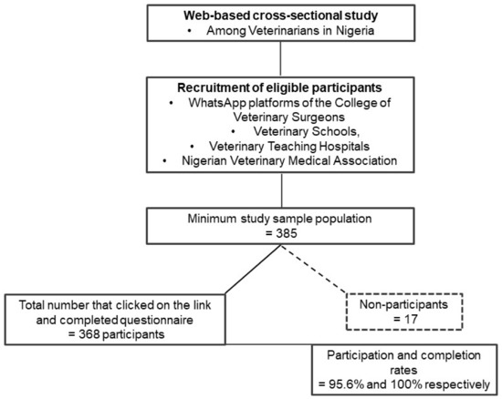 Invitations were sent to veterinarians nationwide to participate in the study using the WhatsApp platforms of the College of Veterinary Surgeons, Veterinary Schools, Veterinary Teaching Hospitals and the Nigerian Veterinary Medical Association. The questions for the online survey were in English and developed after reviewing pertinent literature. The link to the survey was included in the sent invitations and brief descriptions of the purpose of the survey were provided. Duplicate entries were avoided by preventing users with the same IP address access to the survey twice in the Google Form settings. The questionnaire was anonymous in order to maintain the privacy and confidentiality of all information collected in the study. The online survey was conducted from 23 April (second phase of lockdown) to 31 May (last week of the lockdown). Figure 2 provides details of the recruitment of veterinarians for this study.