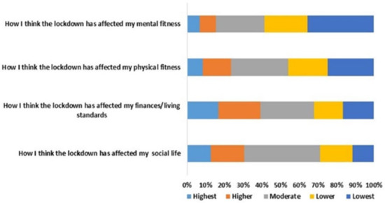 In section three of the questionnaire, the respondents’ attitude was assessed by 15 questions. The questions were structured to evaluate their attitudes towards adherence to the non-pharmaceutical intervention and social distancing regulations implemented by the government, for example, if going out during the lockdown was acceptable, attitudes towards seeking updates on COVID-19, dispositions to certain activities during the lockdown and prophylactic drugs (orthodox or herbal) taken. The 5-point Likert scale (1-lowest negative effect, 5-highest negative effect) was used to measure the impact of the lockdown on the social, financial, physical, and mental well-being of the respondents. The effect of the lockdown on their sexual performance was also assessed.