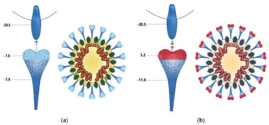 The net charge distributions of the spike protein in SARS-CoV-2, SARS-CoV, and the interactions between the spike protein and ACE2 are shown in Figure 1. The binding part of SARS-CoV-2 during the infection process is S1, as shown in Figure 1b. S1 was positively charged, while ACE2 had many negative charges that will generate two effects. The S1 positive charges are attracted by ACE2 over a relatively long distance because the Coulomb interactions do not need a specific structured area. This means that the ACE2 receptor attracts SARS-CoV-2 easily causing enhanced transmissibility. However, the affinity between Sp and ACE2 was relatively strong due to the Coulomb interactions between the positive and negative charges, so as long as SARS CoV-2 is bound to ACE2, they are difficult to separate. Certainly, after the SARS CoV-2 combined the ACE2, there were hydrogen bonding forces, polar groups, and van der Waals forces between SARS CoV-2 and ACE2.
