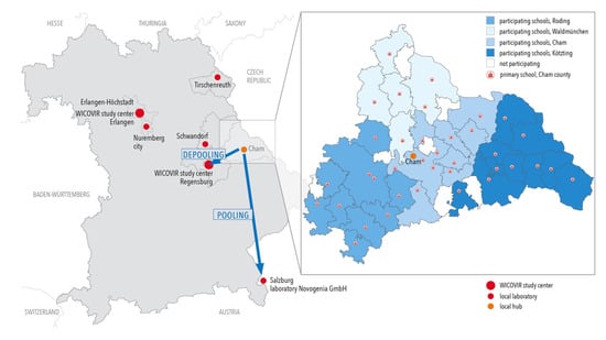 The rural County of Tirschenreuth was a COVID-19 hotspot in the first wave of the pandemic in Germany in the spring of 2020, and showed a high incidence of infections again early in the second wave in the winter of 2020–2021. However, through intensive voluntary testing introduced early on in 2021 and strict infection protection measures, as well as the participation in scientific evaluation of the previous breakouts, Tirschenreuth achieved a continuously low incidence of new COVID-19 cases early in 2021. Participation in the WICOVIR project was thus a logical next step. Overall, eight schools, with 2280 students and teachers, participated in the project. The program was initiated on 22 April 2021, and after clearing administrative issues and financing, regular testing started on 10 May 2021. For testing in Tirschenreuth county, a local laboratory was available, substantially reducing transport time to less than one hour. WICOVIR was also set up in the rural county of Schwandorf, in which testing was implemented in a selection of primary and secondary schools using a laboratory in the county. Due to restrictions in financing, however, only seven schools were able to participate in the testing there.