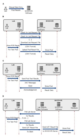 Interfacing with laboratories. Data transfer concepts for the implementation of WICOVIR according to different laboratory set-ups. Four separate interfaces for electronic data exchange between labs and the WICOVIR software have been established. They use different levels of standardization with respect to data formats and protocols ranging from manual entry (A) over exchange of CSV files (B) to HL7 (C) and LDT (D).