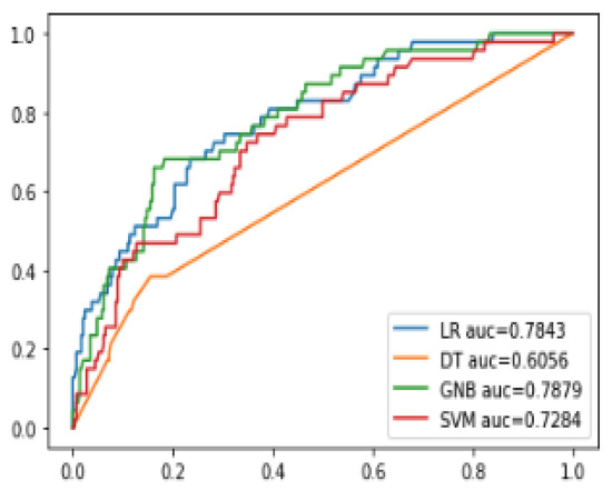 We performed an 80-20 split on the international dataset (Adamson et al., 2020), using 80% of the data as the training data and 20% of the data as the testing data. The ROC curves are shown in Figure 4 and indicate that all the models achieve an acceptable good (area under the curve, AUC > 0.7) except the decision tree model (DT) (see Table S1 in Supplementary Materials S2). In short, the models show a good trade-off between sensitivity and specificity, with a good discrimination performance.
