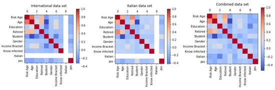 The features for each of the datasets (international, Italian, and combined) were analyzed using Pearson correlation matrices to determine if the overall feature correlations would remain consistent. Consistently, in all the datasets, age and risk age are positively correlated. These two features are also positively correlated with the condition of being retired. Moreover, the datasets show a consistent negative correlation between age and being a student and, although weaker, a negative correlation between being a student and risk age, and between being a student and education.