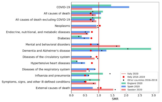 Compared to Italy, age-standardized COVID-19 mortality resulted double in Spain (SMR = 2.11), 1.45 times in England, and 0.75 in Sweden. For all causes other than COVID-19, Italy showed higher mortality compared to Sweden and Spain, but the highest level of mortality was observed in England (SMR = 1.08)