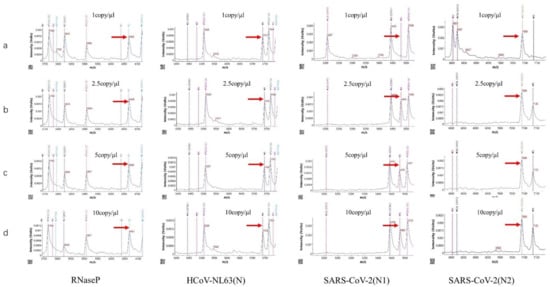 The detection limit of part of target genes: (a) 1 copy/reaction, (b) 2.5 copies/reaction, (c) 5 copies/reaction, and (d) 10 copies/reaction. The red arrow in each figure refers to extended or unextended primer.