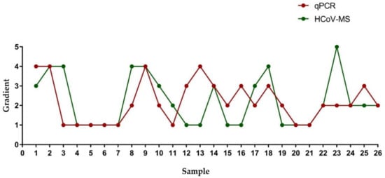 A total of 26 SARS-CoV-2 clinical samples were serially diluted, and the HCoV-MS and RT-PCR methods were used for simultaneous detection to compare their detection sensitivities. The detection limit gradient of the 26 SARS-CoV-2 clinical samples is shown in Figure 3 and Table 4. Results for the majority of the clinical samples were the same for the two methods or differed by only 1–2 gradients. Furthermore, only a few samples showed a significantly different detection gradient in the experiment. Evidently, the detection sensitivity of the HCoV-MS method is almost the same as that of RT-PCR.
