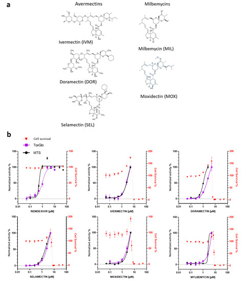 Antiviral and cytotoxic activities of selected compounds against SARS-CoV-2 infection in Vero E6 cells. (a) Structure of avermectins and milbemycins drugs used in this study. (b) Vero E6 cells were infected with SARS-CoV-2 at a MOI of 0.01 with 0.05, 0.1, 0.25, 0.5, 1, 2.5, 5, 10 and 50 µM of the indicated compounds and incubated for 72 h. The cytotoxicity of the drugs to Vero E6 cells was measured by MTS assay. Inhibition of virus replication was either quantified by MTS (black) or ToxGlo (purple) assays. The left and right Y-axes of the graphs stand for mean % inhibition vs. DMSO control and mean % cell survival (red), respectively. Data points are mean values and bars are the standard deviation of experiments performed in duplicate.