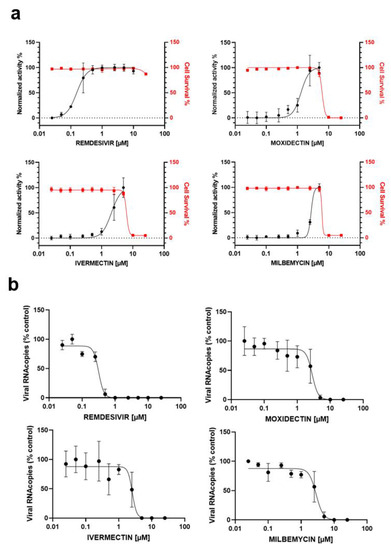 Drugs were purchased from Sigma Aldrich (France): moxidectin (#Y0000772), doramectin (#33993), milbemycin oxime (#Y0001893), selamectin (#Y0000814), ivermectin (#I8000010). Drug structures are presented in Figure 1a. Remdesivir (#282T7766) was purchase from Tebu (France). Drugs were prepared at a concentration of 10 mM in DMSO (Sigma, France). Antiviral activity was assessed by a cytopathic effect (CPE) reduction assay on Vero E6 cells or by RT-qPCR on A549-hACE2 or Calu-3 cells. Briefly, 30,000 cells per well were cultured in 96-well culture plates (Dutscher, BERNOLSHEIM, France) for 24 h. Drugs were diluted from stock to 50 µM in DMEM or 25 µM RPMI for testing antiviral activity on Vero E6 cells or A549-hACE2 cells, respectively. Cells were incubated with 100 µL of the compounds diluted in DMEM/0.5% DMSO (v/v) (Vero E6) or RPMI/0.25% DMSO (A549hACE2) or DMEM/0.25% DMSO (Calu-3) at the indicated concentrations and the plate were incubated for 2 h. Subsequently, cells either were mock infected (for analysis of cytotoxicity of the compound) or were infected with 400 PFU of virus per well (MOI of 0.01) in a total volume of 110 μL of medium with compound. In that context, the experiments were performed in an on-going viral replication in the treated cells.