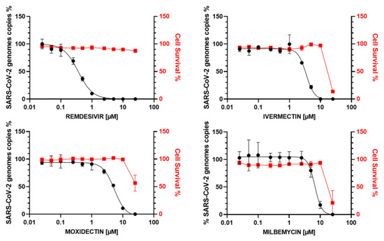 The cellular response to virus infection can differ depending on the infected cell type; therefore, we used the human bronchial epithelial Calu-3 cell lines, which express SARS-CoV-2 receptor ACE2 [34] and might better reflect physiological conditions than A549 cells ectopically expressing ACE2. In addition, Calu-3 cells, as with the airway epithelium, express low amounts of the cysteine protease cathepsin L (CTSL), which mediates SARS-CoV-2 entry into these cells by a pH-independent pathway. In contrast, entry of SARS-CoV-2 into Vero cells is CTSL-dependent and thus uses a pH-dependent pathway [35]. As SARS-CoV-2 infection does not produce evident CPE when infecting the Calu-3 cells, we monitored virus replication upon drug addition by quantifying intracellular viral RNA by RT-qPCR (Table 1, Figure S2). Toxicity of the compounds was evaluated by MTS assay. The results are reported in Figure 3 and Table 1. The control remdesivir was again found to be a potent SARS-CoV-2 inhibitor with EC50 = 0.35 µM and a SI greater than 70. Interestingly, cell viability was less affected upon incubation with IVM, MOX and MIL with CC50 estimated in the range of 22–26 µM. Consequentially, the antiviral activity of the three compounds could be defined more precisely and raised EC50 MOX = 5.55 µM (SI = 4.7), EC50 IVM = 3.36 µM (SI = 5) and EC50 MIL = 6.8µM (SI = 3.3). In summary, avermectins and milbemycins did efficiently block the infection of Calu-3 cells with SARS-CoV-2. The calculated EC50 were found in the same range than those found in Vero E6 and A549hACE2 cells, thus being cell-line independent, suggesting drug mechanistic effects that do not alter virus entry pathways [36].