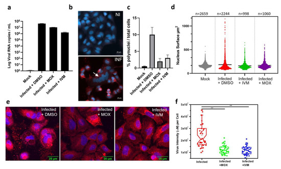 We finally confirmed MOX and IVM antiviral activities by in cellulo monitoring in A549 hACE2 cells after 45 h incubation in the presence of 4 µM of drugs (Figure 4a). The viral S/cellular ACE2 interaction has been shown to be responsible for the cell–cell fusion induced by SARS-CoV-2 infection [37]. As reported in Figure 4b, cell fusion was clearly visible in our assay using A549-hACE2 cells, where typical cells with multiple nuclei were detected using DAPI after infection with SARS-CoV-2. In contrast, non-significant cell fusion could be observed in non-infected cells (Figure 4c). We thus quantified the number of nuclei/cells (Figure 4c) or nucleus surface on a cell population in mock and infected cells and compared the results with infected cells treated with 4 µM IVM or 4 µM MOX. Both results unambiguously showed a strong limitation of cell fusions in drug-treated cells, confirming the properties of IVM and MOX to reduce viral dissemination in cell culture.