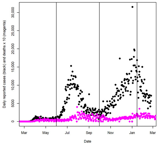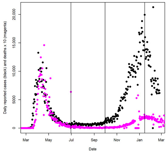 Total numbers of daily reported COVID-19 cases and deaths (multiplied by 10) in New York State. The three vertical lines mark the dates: 30 June 2020, 30 September 2020 and 15 January 2021.