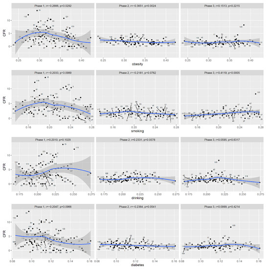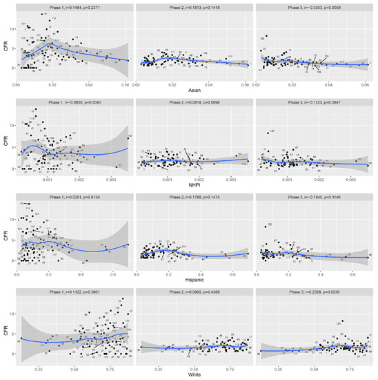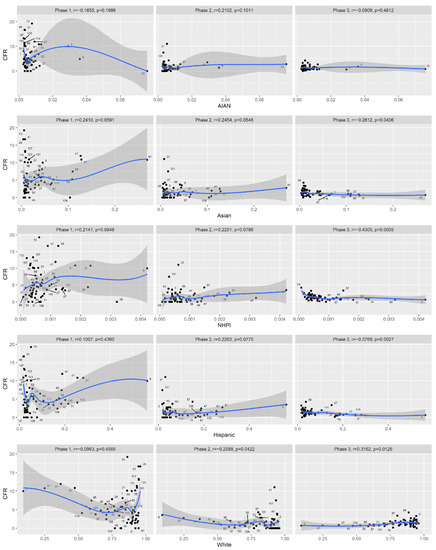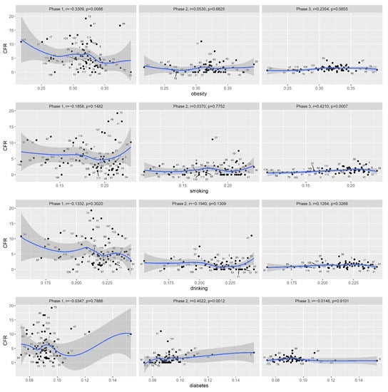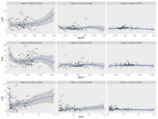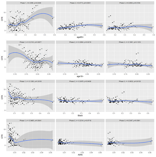 During the second phase (1 June to 30 September 2020), the reported CFR was significantly correlated with the percentage of the population aged 65 or older, the percentage of the population aged 18 or younger, the percentage of the black population and the prevalence of obesity. During the third phase (1 October 2020 to 15 January 2021), the percentage of the population aged 65 or older was still significantly correlated with the reported CFR, but the correlation was less significant compared to the first two phases. The reported CFR was significantly correlated with median household income, unemployment rate, the prevalence of smokers and the fatality rate of respiratory diseases.