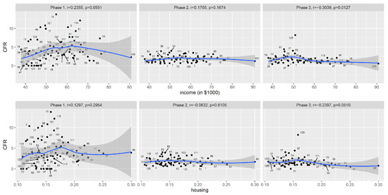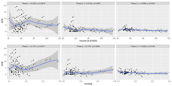 During the third phase (1 October 2020 to 15 January 2021), increased COVID-19 CFR at the county level was associated with many measurements of racial compositions, decreased median household income, increased prevalence of adult smokers, increased HIV prevalence and increased stroke and respiratory disease mortality rates. The negative association with housing problems was likely due to confounding. The noise level was much lower during this phase. From the scatter plots, we see that overall, the reported CFRs had greatly decreased in phase 3. When it comes to median household income, the reduction in CFR among the high-income counties was greater than among the low-income counties.