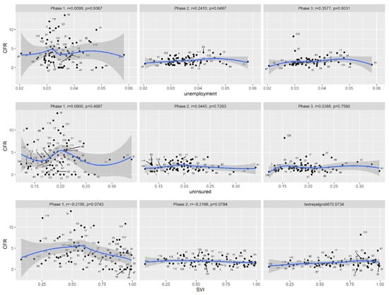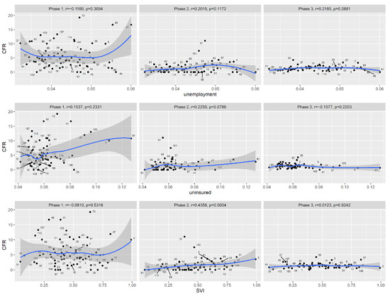 Scatter plots of the reported CFR versus socioeconomic covariates among Florida counties during the three COVID-19 phases. The y-axes are the reported CFR. The x-axes in the plots (from top to bottom) are income, housing, unemployment, uninsured and SVI (See Table 1 for detailed descriptions of the variables).