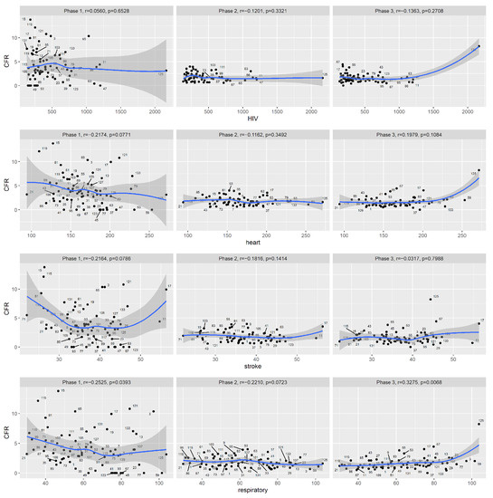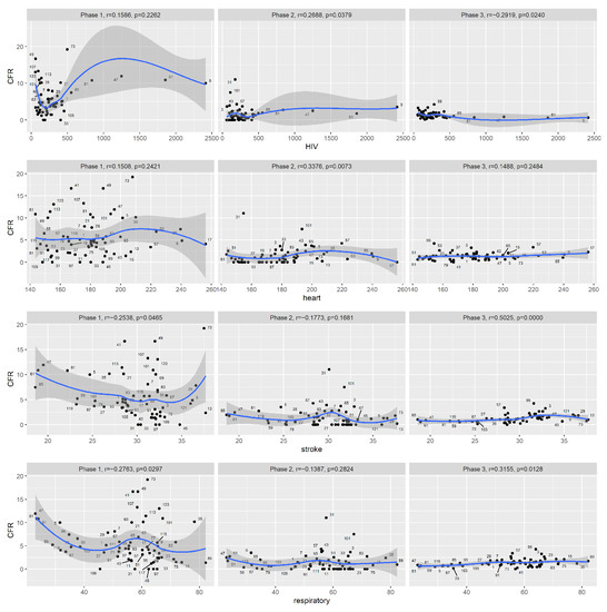 According to Spearman’s rank correlation test results (listed in Table 3), during the first phase (1 March to 30 June of 2020) of COVID-19, among counties in New York State, the reported CFR was significantly correlated with the prevalence of an obese population, and also moderately correlated with stroke and respiratory diseases mortality rates. However, the signs of the correlation coefficients are all counter-intuitive: for example, counties with higher stroke mortality rates actually tended to have lower reported CFRs for COVID-19 during this period. This is likely due to confounding factors: for example, one contributing factor is that the virus hit major cities first, at a time when the county was not yet prepared to respond. To visually inspect the trends, we plotted the reported CFR against the covariates (Figure 3, Figure 4, Figure 5). By examining the scatter plots, we see that the reported CFRs were much higher than in later phases. As we know now, COVID-19 tests were not readily available during this period, and it was likely patients with severe symptoms were more likely to be diagnosed and recorded. The reported CFRs also showed great variation among counties, and for many covariates, the scatter plots display nonlinear and nonmonotonic trends that cannot be captured by Spearman’s rank correlation.