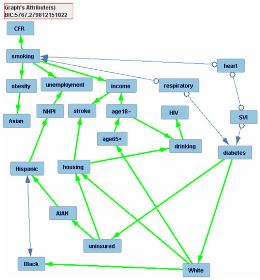 As the pandemic progressed, the data became much less noisy, and interesting association patterns started to emerge. In the third phase of both states, the reported CFR was more associated with socioeconomic factors and health factors. The graphical model suggests that in both states, the prevalence of adult smokers was most directly associated with reported CFR. It is not surprising that the median household income was associated with the CFR during the third phase in both states. A cnbc.com article [20] pointed out that low-income workers tended to work in sectors that were considered “essential” during the pandemic, and their jobs often required them to be on-site. These factors increased their risk of being infected by COVID-19. In the third phase, lockdown restrictions were lighter compared to the earlier two phases, but increased economic activities also meant an increased possibility of those essential workers being infected with COVID-19. People living in more socio-economically disadvantaged neighborhoods and minority ethnic groups have higher rates of almost all the known underlying clinical risk factors associated with the severity and mortality of COVID-19, including hypertension, diabetes, asthma, chronic obstructive pulmonary disease (COPD), heart disease, liver disease, renal disease, cancer and cardiovascular disease [6], so an exact causal relationship is difficult to infer from observational data.