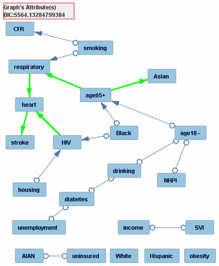 Tetrad software (Ramsey et al, Pittsburgh, USA) 7.1.0-0 [16] was used to build graphical models to examine associations between the covariates and the reported CFR during the third COVID-19 phase in each state. The Greedy Fast Casual Inference Algorithm for continuous random variables (GFCIc) [17] was used to build the graphical models. GFCIc takes a dataset of continuous variables as input and outputs a graphical model called a partial ancestral graph (PAG), which represents a set of causal Bayesian networks that cannot be distinguished by the algorithm. The GFCIc assumes that cases in the data are independent and identically distributed. The formal interpretation of nodes and edges in PAG is listed in Table 2 [18]. At a more intuitive level, in the large sample limit, the PAG [19] output by GFCIc will entail the set of conditional independence relationships judged to hold in the population represented by its input dataset. With a finite sample size, the resulting graphical model may not be completely accurate, but one can use the PAG that GFCIc returns as a data-supported hypothesis about causal relationships that exist among the variables in the dataset.