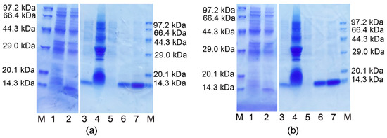 Expression and purification of the ectodomains of ORF7a and SDS-PAGE analysis. (a) ORF7a-1. (b) ORF7a-2. Lane M, protein molecular weight standards; 1, whole cell samples collected from E. coli containing recombinant plasmids after culturing for 1 h; 2, whole cell samples collected from E. coli containing recombinant plasmids after culturing for 6 h; 3, supernatant obtained after refolding; 4, precipitation after refolding; 5, collected solution passing through the nickel column; 6, protein sample obtained after imidazole elution from the nickel column; 7, concentrated protein sample after purification by size-exclusion chromatography.