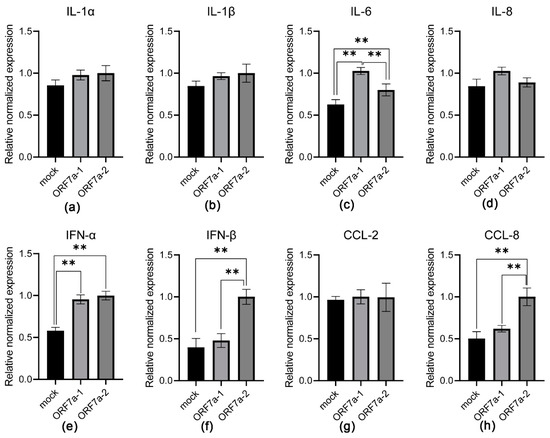The effect of extracellular stimulation of ORF7a protein on the transcription of inflammatory cytokines, interferons, and chemokines in A549 cells. (a) IL-1α. (b) IL-1β. (c) IL-6. (d) IL-8. (e) IFN-α. (f) IFN-β. (g) CCL-2. (h) CCL-8. Error bars are mean ± standard error of the mean (n = 3). ** p < 0.01.