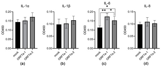 After stimulating the A549 cells with recombinant ORF7a-1 and ORF7a-2 for 48 h, the expression levels of some proinflammatory cytokines in the cell supernatants were detected by enzyme-linked immunosorbent assay (ELISA) (Figure 4). In the supernatant of A549 cells stimulated by ORF7a, the proinflammatory cytokine IL-6 was significantly up-regulated. The effect of ORF7a-1 in up-regulating IL-6 was stronger than that of ORF7a-2. Similar to that revealed by RT-qPCR, the up-regulation of IL-1α, IL-1β, and IL-8 in lung epithelial cells was not significant after ORF7a stimulation.