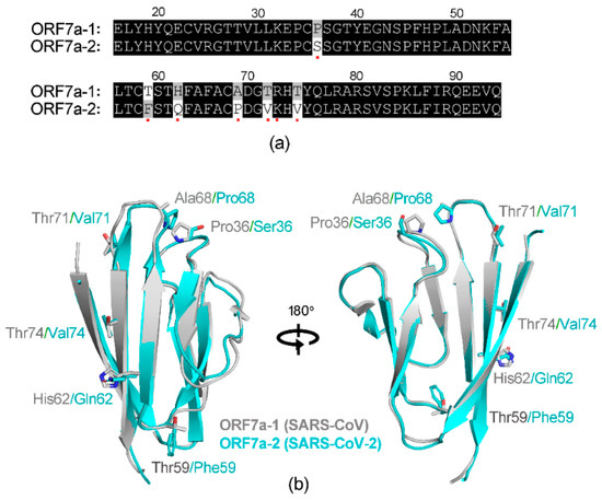 The amino acid alignment of the ectodomains of ORF7a-1 and ORF7a-2 was performed by the Clustal Omega online program (https://www.ebi.ac.uk/Tools/msa/clustalo/, accessed on 15 August 2022). Structural alignment and root mean squared deviation (RMSD) value calculation were carried out by the structural alignment function of the PyMOL software (Schrödinger). The protein structural figure was prepared with PyMOL.