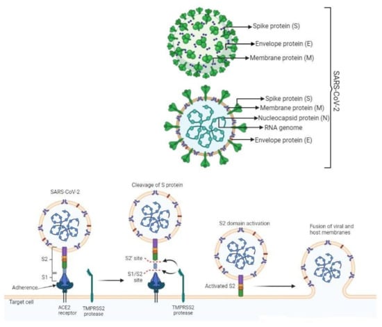 Four structural proteins comprise the SARS-CoV-2 virion: the Envelope Protein (E), the Membrane Protein (M), the Nucleocapsid Protein (N), and the Spike Protein (S). SARS-CoV-2 induces infection via four stages of development. During the early stages, angiotensin-converting enzyme 2 (ACE2) binds to the S1 motif of the host cell’s S protein, resulting in the cleavage of the S protein by TMPRSS2 and activation of the S2 motif in anticipation of the stage 3 fusion. When S2 stimulation is present at stage 4, the proactive, single-stranded RNA molecule of a virus is more likely to be incorporated into the recipient’s DNA. Initiation of MDA5 or RIG-I in response to DNA precursor replication may initiate a chain reaction through MAVS, leading to the generation of type I and type III interferons (IFNs). Interferons induce interferon-stimulated gene expression by activating paracrine and autocrine signaling channels through plasma membrane receptors and the JAK–STAT1/2 signaling complex (Figure 1) [].