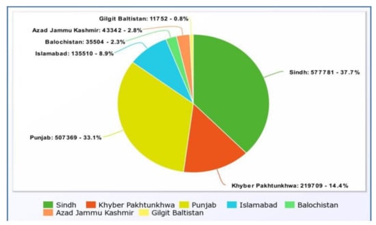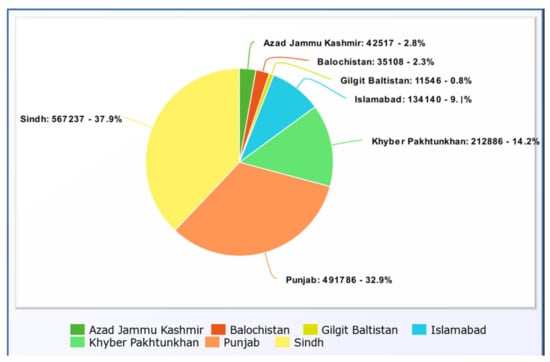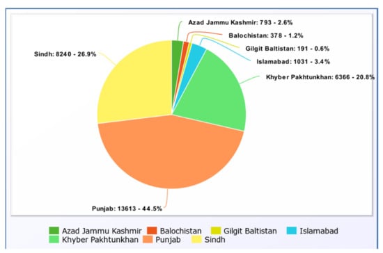 Pakistan is a country with a developing status and has a population of about 220 million people. Gilgit Baltistan, Punjab, Khyber Pakhtunkhwa (KPK), Sindh, and Balochistan are the five provinces that make up Pakistan. According to the Pakistani Ministry of Health, the country’s first confirmed incident of COVID-19 happened on 26 February 2020, and since that time, a constant spread of the disease has been observed throughout the country [].
