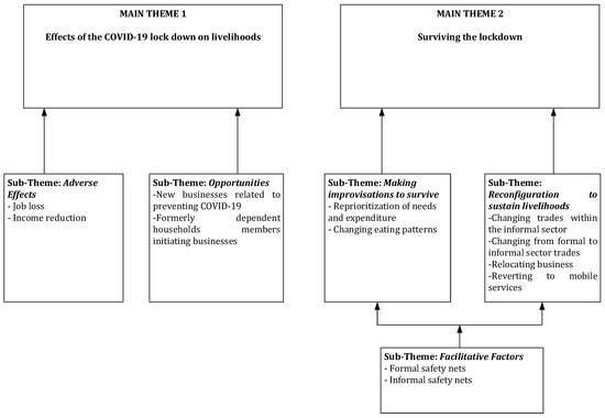 All the qualitative interviews were audio recorded, transcribed verbatim, translated into English by a team of experts, and word processed. Members of the study team proficient in the local language compared the transcripts with the original audio interviews to ensure consistency in the translations. Analysis was conducted using thematic analysis techniques. Initially, the study team read through printed transcripts and identified emerging themes. The team then generated a list of relevant codes from emerging themes to form a coding scheme following the strategies suggested by Maxwell [36]. All data were imported into Atlas.ti qualitative data analysis software and electronically coded. The coding process involved reading and rereading the data as sentences, paragraphs, and whole sections were coded according to the identified themes. Query reports were run and read through to closely examine issues that commonly appear in the transcripts [37]. This article draws on data from two broad themes; effects of the COVID-19 lockdown on livelihoods and surviving the lockdown, and five sub-themes; adverse effects, opportunities, making improvisations to survive, reconfigurations to sustain livelihoods, and facilitative factors as illustrated in Figure 1. For main theme 1 (effect of the COVID-19 lockdown on livelihoods), Figure 1 illustrates that the COVID-19 lockdown primarily affected the livelihoods of informal sector populations in two ways. It imposed adverse effects but also presented livelihood opportunities. The main adverse effects were job loss and reduced incomes, while livelihood opportunities included new business openings for products used in the prevention of the spread of COVID-19 and pushing erstwhile dependent family members to initiate income-generating activities to provide for the home when breadwinners lost jobs.